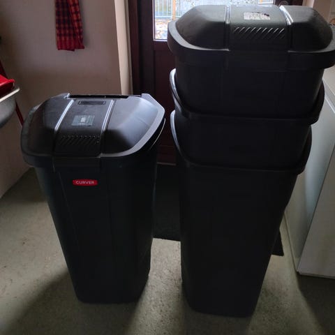 Metal affaldsspande med låg, velegnet til udendørs brug. Pris er pr stk, eller alle 5 for 300kr