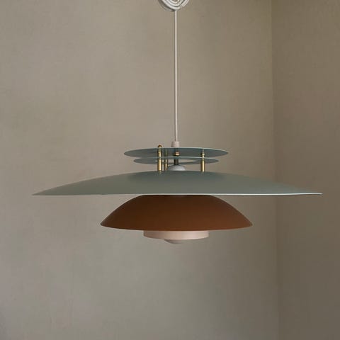 En loftslampe i mintgrøn og støvet mørkegrøn. Med messingfarvede mellemstykker.