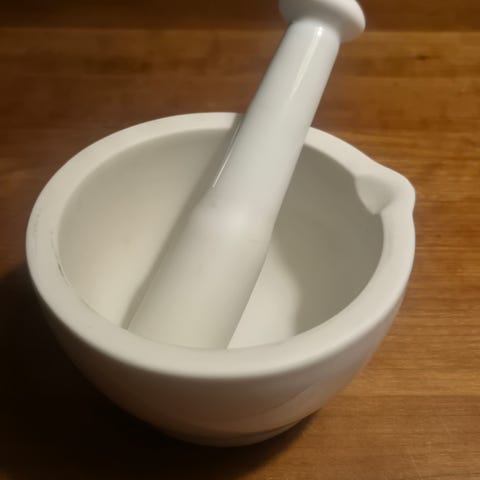 Morter, Galzone, i porcelæn med hældetud og støder - nu / ubrugt - højde 7 cm og Ø 12 cm. Sendes gerne, hvis køber betaler porto.