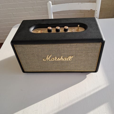 Marshall højtaler med kontrolknapper til volume, bas, diskant og gain. Sort kabinet med guldfarvet frontpanel og Marshall-logo. Tilslutningsmuligheder på bagsiden.