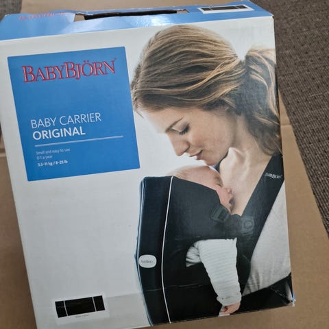 Ergobaby bæresele i beige farve med justerbare stropper. Designet til komfortabel bæring af baby. Materiale og størrelse ikke oplyst.