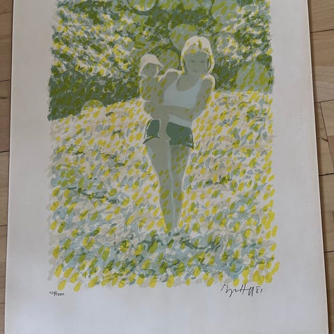 Johannes Ewald litografi fra 1898. Sort-hvid kunsttryk med motiv af en person siddende ved et bord udendørs. Indrammet i en træramme. Signeret med initialer og årstal.