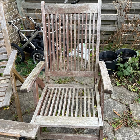 Parasol og 2 strand stole.