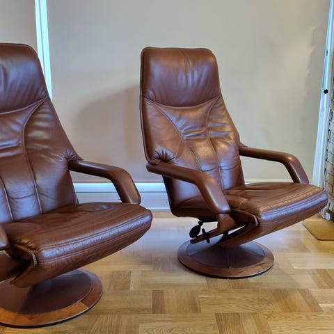 To virkelig flotte og velholdte Berg Dream Balance Milance lænestole/hvilestole i cognac brun med indbygget manuel benstøtte.