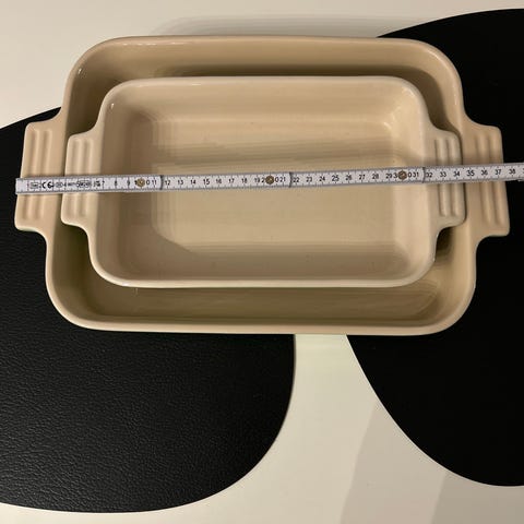 Le Creuset ovnfaste fade sæt i rød og beige farve. Sættet indeholder flere fade i forskellige størrelser, velegnet til bagning og tilberedning i ovn. Materialet er emaljeret støbejern, som sikrer jævn varmefordeling. Fade kan bruges til både madlavning og servering.