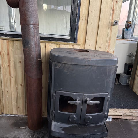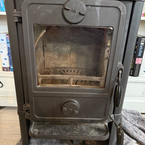 Smuk Morsø brændeovn i støbejern med dekorative relieffer. Ovnen har en åben topsektion og en lukket forbrændingskammer med låge. Designet til opvarmning med brænde og fremstillet i robust støbejern.