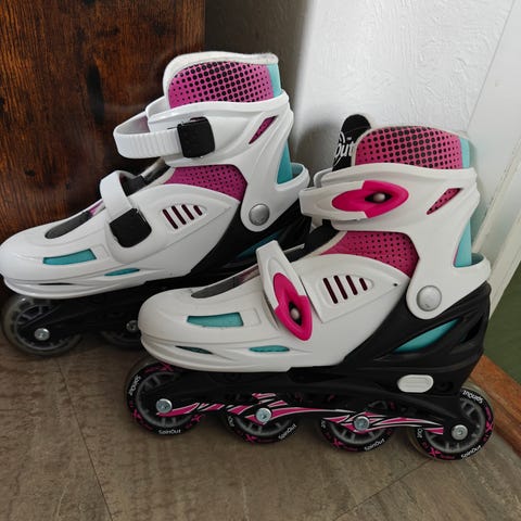 Hej DBA. Min datter sælger sine rulleskøjter hun ikke kan passe mere. Er kun brugt en håndfuld gange indendørs og er som ny.