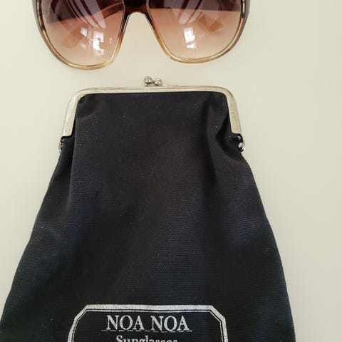 Solbriller med runde orange glas og metalstel. Stellet er tyndt og sølvfarvet med sorte ender på stængerne. Brillerne har en let og enkel konstruktion.