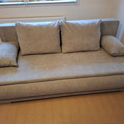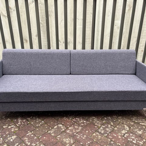 Grå sovesofa med mulighed for opbevaring. Den er i god stand trods en del år bag sig, da den det meste af tiden har stået i et showroom.