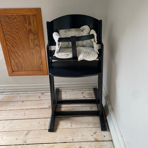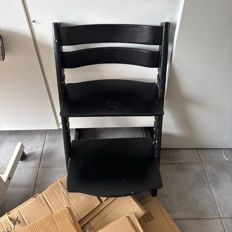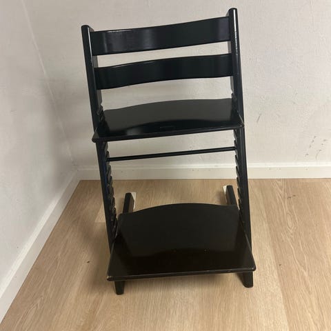 Stokke højstol i sort. Den har brugsspor, men kun nogle små.