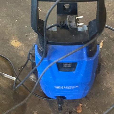 Nilfisk højtryksrenser med tilbehør til rengøring. Indeholder højtryksrenserenhed, 2 forskellige dysser, lanse, og terrasserenser samt sæbedispenser. Velegnet til rengøring af overflader med højtryksvand.
