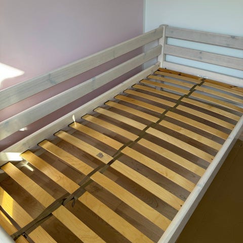 Flexa stel der er ombygget til elevationsseng. Det er en velfungerende løsning, og indbygningen er helt skjult når madrassen er nede.