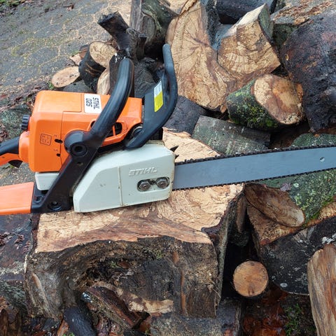 Stihl 039, ældre motorsav med få drift timer. Starter og kører perfekt, rigeligt med kræfter 64cc. Nyere sværd (18”) og kæde, ny ekstra kæde medfølger. I dag kan saven stadig købes af ny (Stihl ms 391)