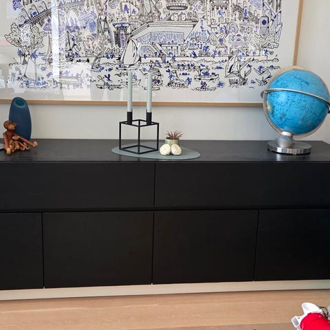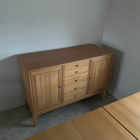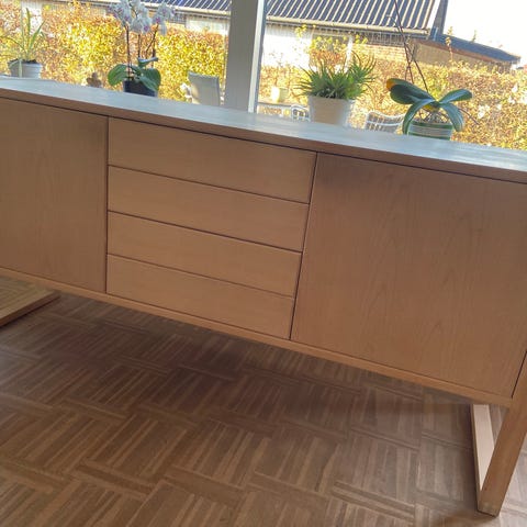 BoConcept skænk i træ med flere skuffer og skabe. Skænken har et enkelt og funktionelt design, der passer til opbevaring i stue eller spisestue.