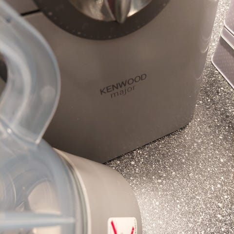 Kenwood Chef Major køkkenmaskine med rustfri stål skål. Inkluderer multi food grinder tilbehør med 3 skærme og blender med 1,5 liters kapacitet. Maskinen er velegnet til forskellige madlavningsopgaver og har flere funktioner for alsidig brug i køkkenet.