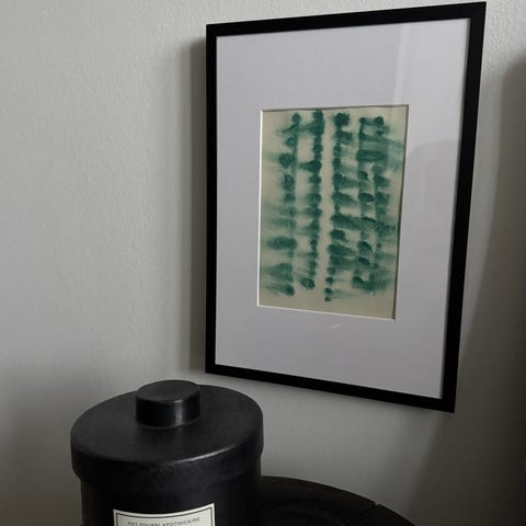 Håndmalet akvarel i dyb grøn tone, hvor farven får lov at bevæge sig frit og danne bløde, næsten botaniske strukturer. Værket har en rolig, meditativ kvalitet – som et øjeblik i naturen fanget på papir.