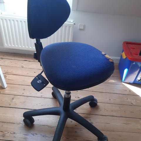 Kontorstol, Fed retro kvalitets hæve-sænke-stol fra 'Stål&Stil'. - oprindeligt produceret som laboratoriestol. Meget stabil på 5 hjul. God sidde komfort - kan nemt reguleres i ryg og højde. Hævesænkepatron virker som den skal. Stolen er med blåt uldstof. Det er gået et hul på stoffet forrest på sædet (skumgummipolster under er intakt), kan evt. repareres eller sædet ombetrækkes. Derfor prisen.