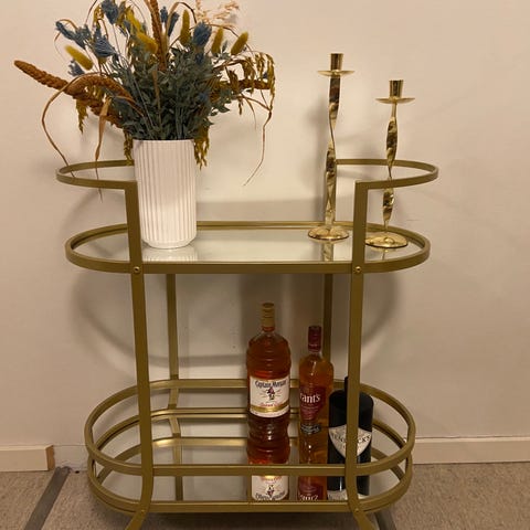 Guld barvogn med sorte hjul og 2 glas hylder.