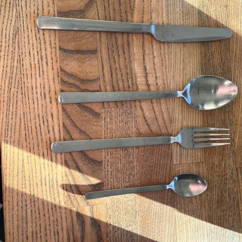 Raadvad bestiksæt bestående af skeer, gafler og knive. Sættet indeholder flere enheder af hver bestiktype, egnet til daglig brug i køkken og til spisning. 4 knive, 4 gafler, 3 spiseskeer og to teskeer. Kan sendes eller afhentes i Aarhus C.