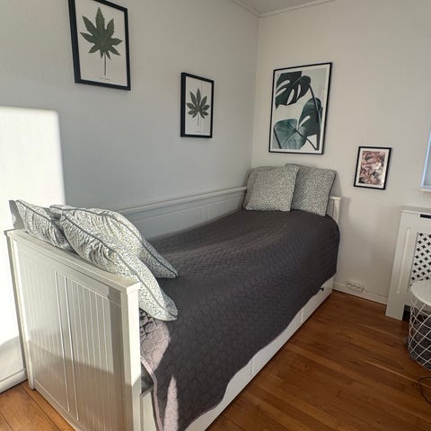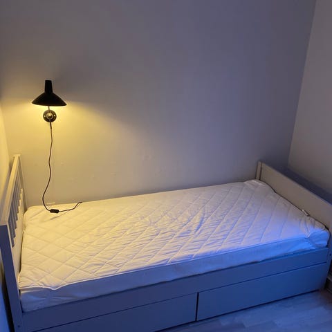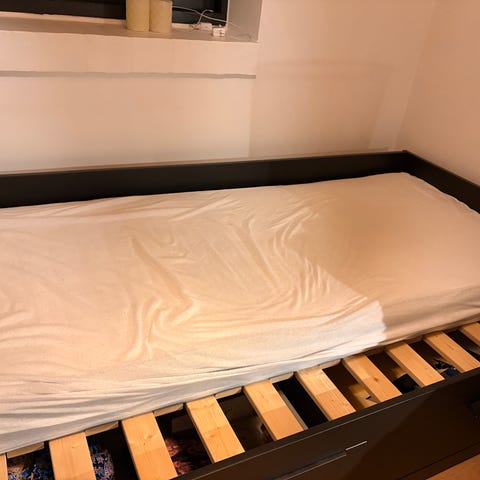 BREKKE seng (Ikea) med 3 store skuffer på hjul til opbevaring og labelbund. b: 90 l: 202 h: 30. Børneseng, juniorseng, ungdomsseng, gæsteseng, seng/sofa i sommerhuset eller bare en smart og enkel seng med super opbevaring.