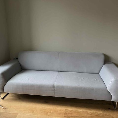Sofa med lidt afblegning fra solen på enkelte puder fra hjem med hund men er støvsuget