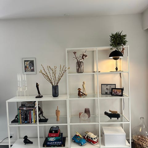 Super fint sæt, reol og tv-reol fra Ikea. Ramme af metal. Midterste hylde af hærdet glas giver et let og luftigt udtryk.