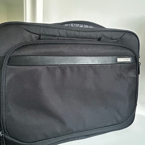 Samsonite let taske, sort med rødt. Som ny. Tre rum indvendigt, to lynlåslommer udvendigt. Bredde 43cm. Højde 33cm + greb. Dybde 6,5cm. Vejer 550g.