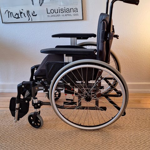 Kørestolen har været brugt i forbindelse med korsbåndsskade, og har særlige fodstøtter, der gør, at benet kan holdes højt, mens kørestolen bruges.