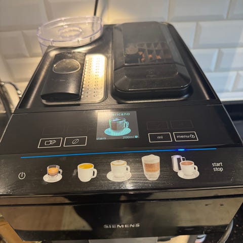 Fuldautomatisk espressomaskine fra Siemens. Der medfølger ekstra rengøringsudstyr til en værdi af ca. 500 DKK. Nypris for kaffemaskinen er ca. 7000 DKK.