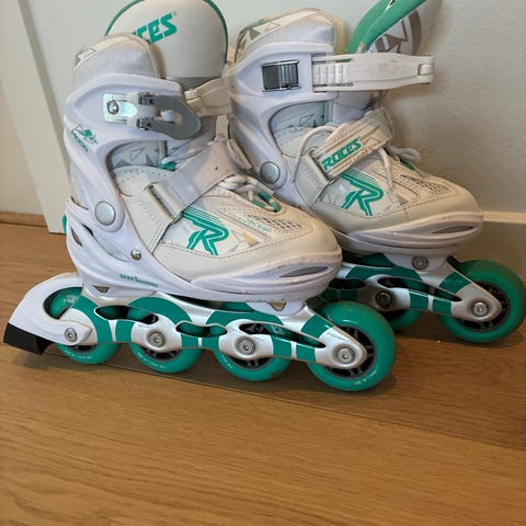 Roces rulleskøjter til børn i størrelse 37. Skøjterne har en hvid og blå farvekombination og er designet til rulleskøjtning. De er udstyret med snørebånd og velcrolukning for god pasform og støtte.