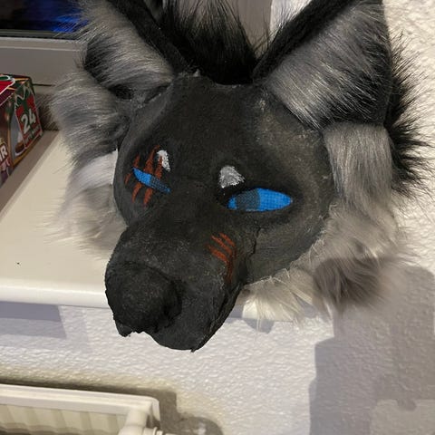 Håndlavet hundemaske med brun yderside og hvid inderside. Masken er lavet af maske fra panduro og beklædt med filt, der giver en tekstureret overflade. Den har udskæringer til øjne og er designet til at dække halvdelen af ansigtet cirka. Masken har store, spidse ører og er egnet til kostumer eller dekoration.