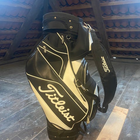 Titleist golfbag i blå farve med flere lommer og rum til golfudstyr. Tasken har et ruminddelt topstykke til organisering af golfkøller.