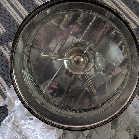 Forlygte. Ubekendt mærke. indikatoren ovenpå lygten er blå. Glasset måler 11 cm i diameter.