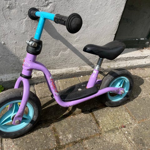 Løbecykel i lyserød med sort sæde og håndtag. Er brugt men i god stand og er stabil.