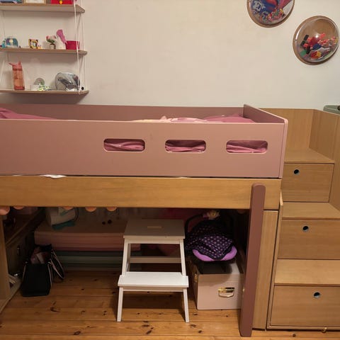 Sengen er i rigtig god stand. Der medfølger en Flexa-madras, som dog har enkelte pletter. På den lysegrønne sengegavl er der mindre afskalning.