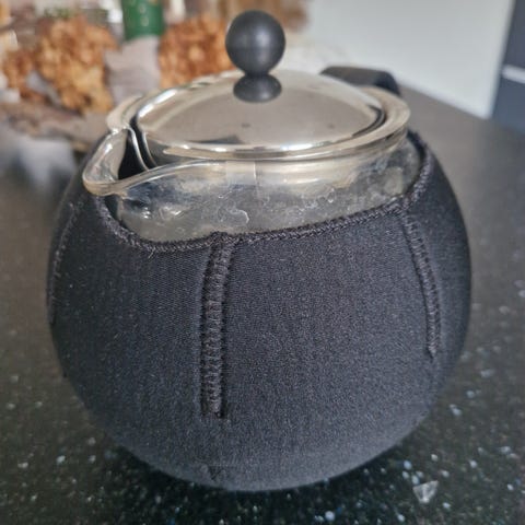 Thekande med filterindsats fra Bodum. Fungerer fint, bemærk noget af plastikken er knækket på indsatsen.