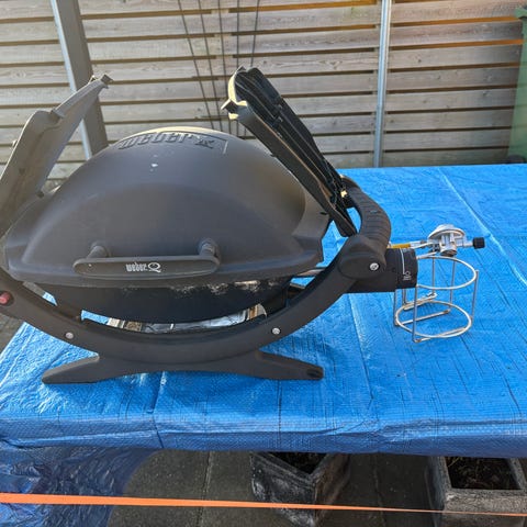 Weber Q 300 gasgrill med hvid låg og sort stel. Grillen har to kontrolknapper til justering af varme. Designet til udendørs brug med tilslutning til gasflaske..