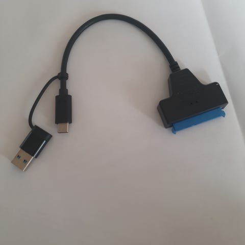 Adapterkabel med USB 3.0 stik i den ene ende og SATA stik i den anden ende. Anvendes til tilslutning af SATA harddiske eller SSD'er til en computer via USB-port. Sort kabel med blå stik på USB-siden, designet til dataoverførsel.