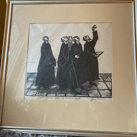 Litografi, Jane Muus, b: 40 h: 50, 2 billeder, der blev tegnet til Charles Dickens' bog "Et Julekvad på Prosa" fra 1946. Der er tale om Muus' egne tryk.