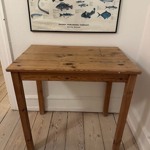 Fint lille træbord med masser af patina og sjæl. Bordet er stabilt og brugbart, og overfladen kan slibes, hvis man ønsker et lysere eller mere ensartet udtryk — eller behold det, som det er, for det autentiske vintage-look.