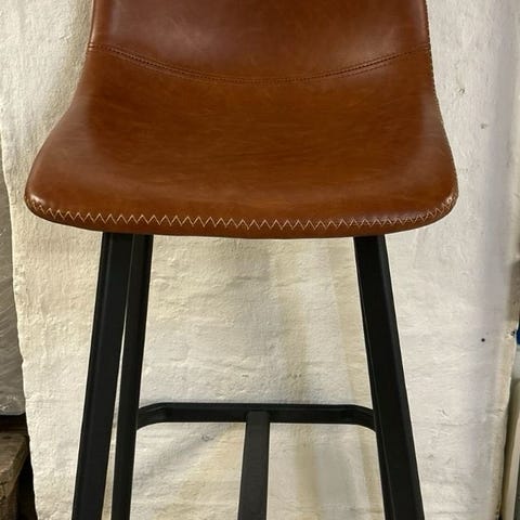 Sæt bestående af barstole med sæde og ryg i brun læder. Stolene har et stel i krom med fodstøtte og justerbar højde. Designet til brug ved bar- eller køkkenborde.