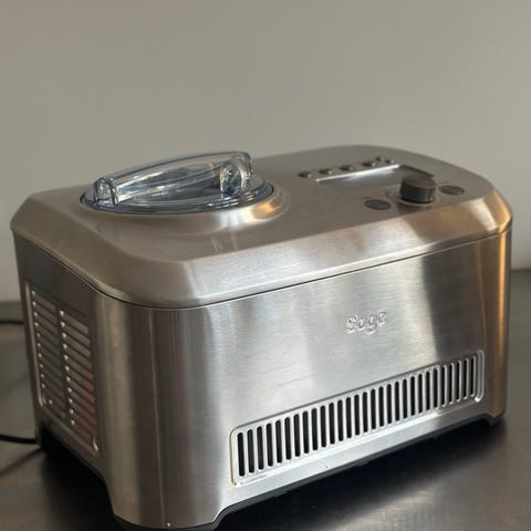 Sage ismaskine i rustfrit stål med digitalt display og knapper til indstillinger. Maskinen har en gennemsigtig låg og en indvendig isblander. Designet til hjemmelavet isproduktion.