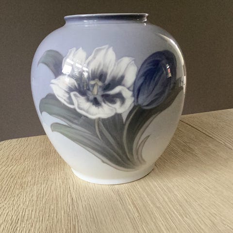 Royal Copenhagen Art Nouveau vase dekoreret med agern og sommerfugle, højde 17,5 cm, diameter 6 cm, pæn og velholdt og er som ny.