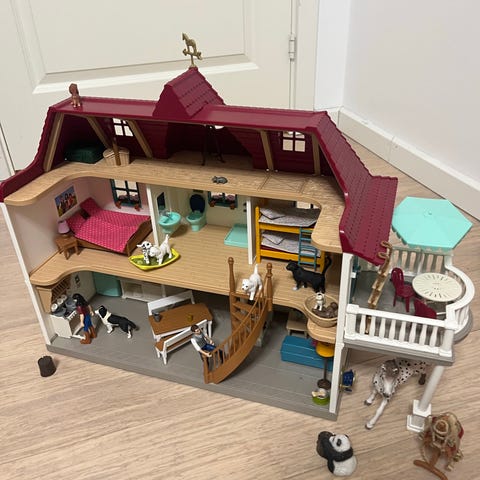 Schleich legetøjsgård med flere rum og tilbehør inklusive møbler, figurer og dyr.