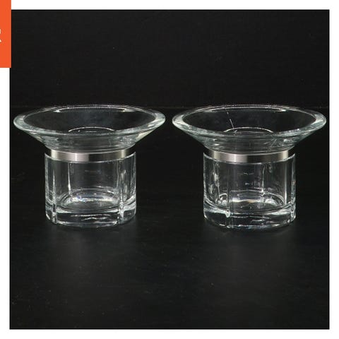 Lyngby Glas Lysestager i lilla farve. Sættet består af tre stager med rillede detaljer i glasmateriale.