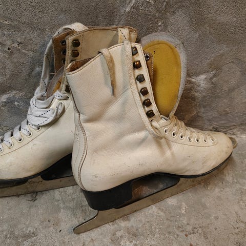 Vintage skøjter i størrelse 39 med sort læderoverdel. Skøjterne har snørebånd og metalblade. Materialet og designet indikerer en klassisk damemodel.