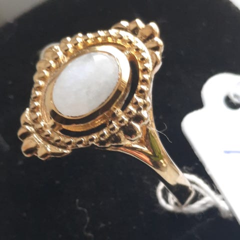 Smuk og feminin 18 karat forgyldt Sterlingsølv ring, ringen er udført med smukke detaljer samt prydet med en stor smuk blå Calcedon.