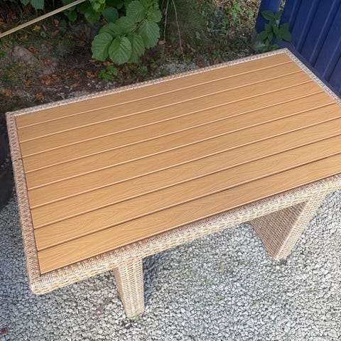 havemøbelsæt bestående af hjørnesofa og bord i flettet materiale.