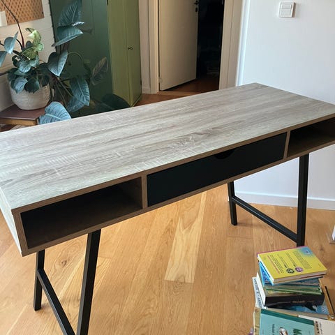 Neptun skrivebord med to taburetter- med brugsspor på taburetter og bordplade- fuldt funktionsdygtigt