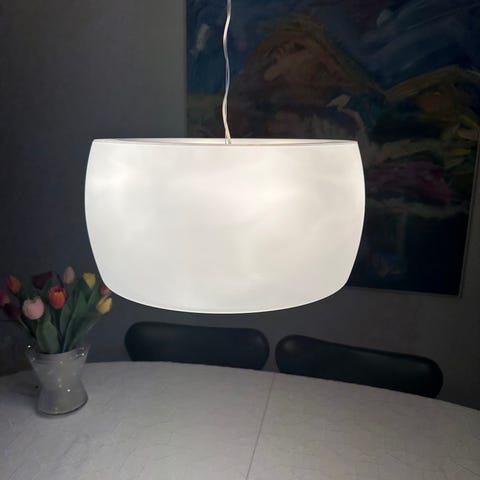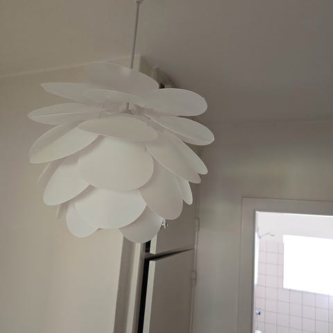 Eddie Loftlampe fra Jysk (udgået?). Sort lampe med hvid inderside. 20 cm høj, 20 cm i diameter.